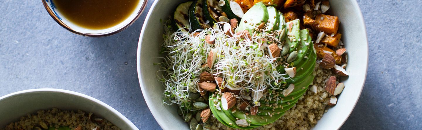 5. Divide the quinoa in the bowls and garnish with all the other loose ingredients: sweet potato, zucchini, alfalfa, avocado, nuts and seeds.