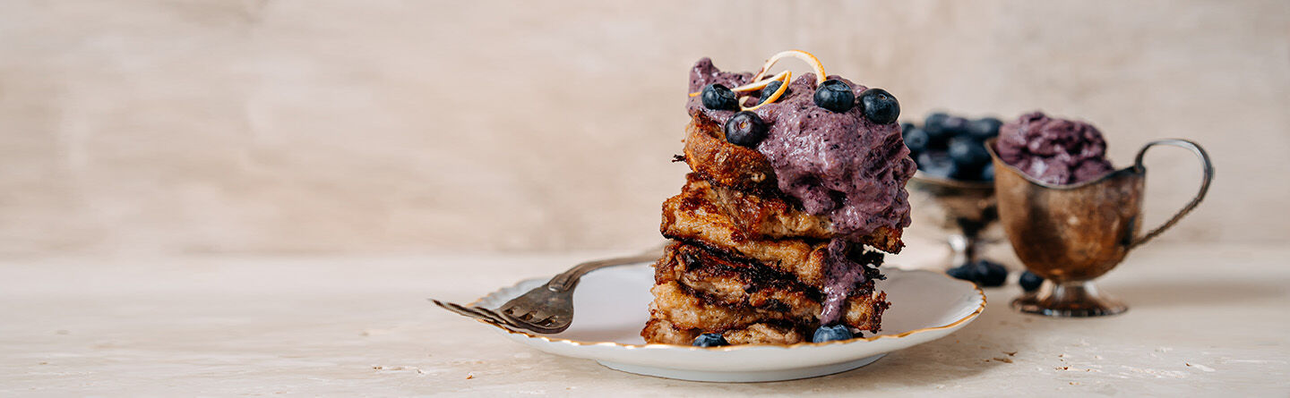 Try our vegan twist on this breakfast delight with a blueberry and orange cream topping